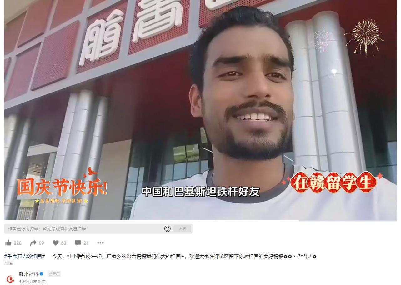 国际学生纷纷送上自己诚挚的祝福。巴基斯坦籍语合中心项目学生SHAHBAZ MUHAMMAD和ZOYA IRFAN录制专门视频,祝福中国朋友们国庆节日快乐。