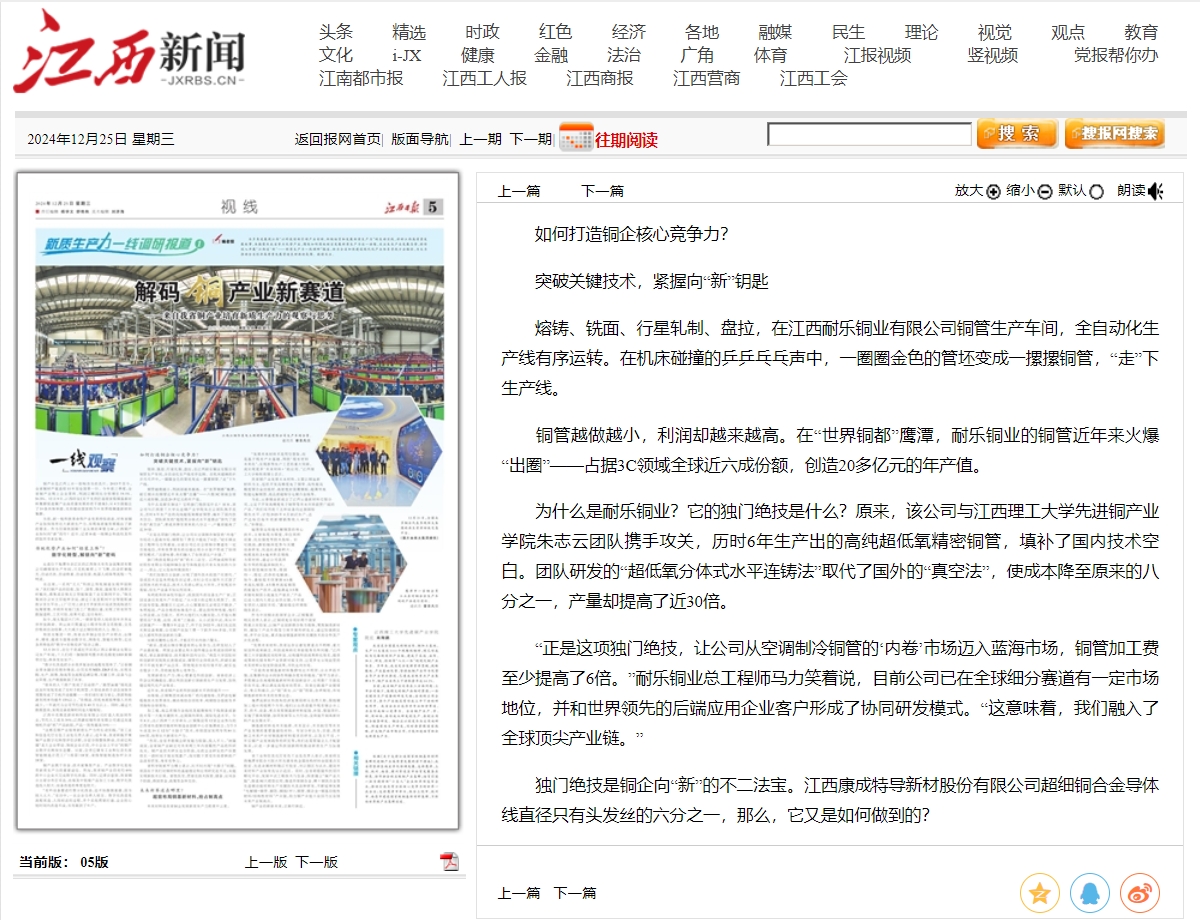铜管越做越小,利润却越来越高。在“世界铜都”鹰潭,耐乐铜业的铜管近年来火爆“出圈”——占据3C领域全球近六成份额,创造20多亿元的年产值。