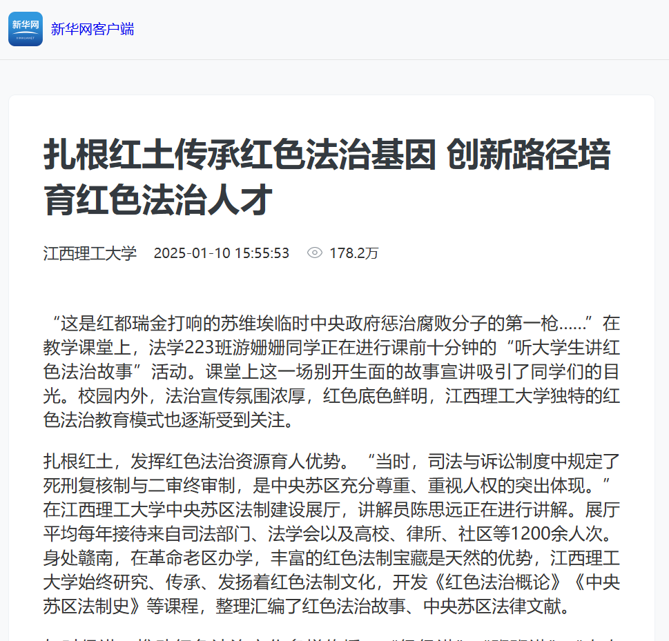 始终研究、传承、发扬着红色法制文化,开发《红色法治概论》《中央苏区法制史》等课程,整理汇编了红色法治故事、中央苏区法律文献。