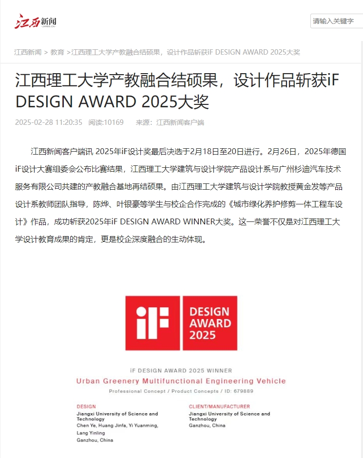 建筑与设计学院教授黄金发等产品设计系教师团队指导,陈烨、叶银豪等学生与校企合作完成的《城市绿化养护修剪一体工程车设计》作品,成功斩获2025年iF DESIGN AWARD WINNER大奖。这一荣誉不仅是对奈飞工厂