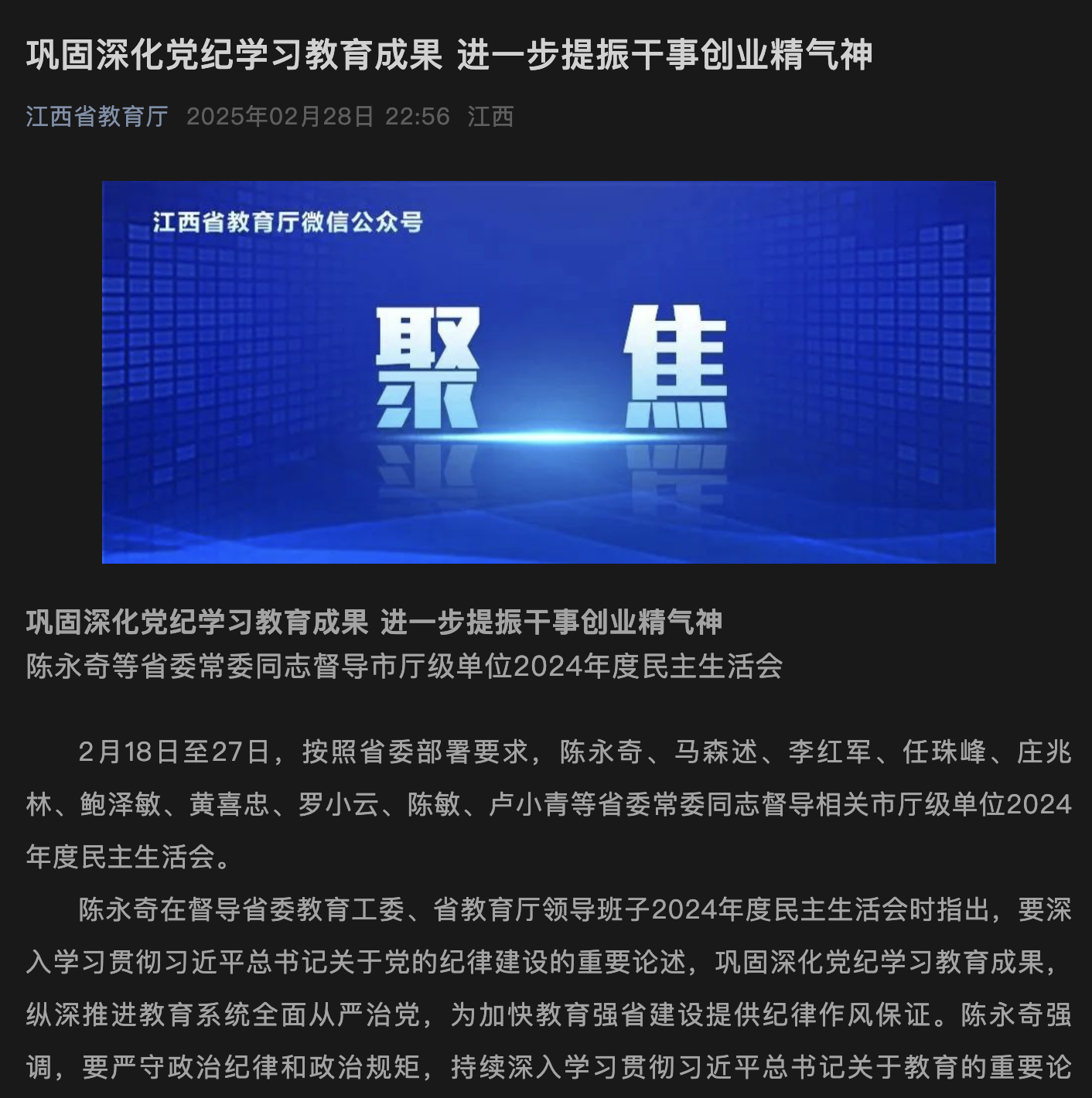 陈永奇在督导省委教育工委、省教育厅领导班子2024年度民主生活会时指出,要深入学习贯彻习近平总书记关于党的纪律建设的重要论述,巩固深化党纪学习教育成果,纵深推进教育系统全面从严治党,为加快教育强省建设提供纪律作风保证。陈永奇强调,要严守政治纪律和政治规矩,持续深入学习贯彻习近平总书记关于教育的重要论述,全面贯彻党的教育方针,以实际行动坚定捍卫“两个确立”、坚决做到“两个维护”。要加强党性修养,坚持教育者先受教育,严格落实中央八项规定及其实施细则精神,把增强党性、严守纪律、砥砺作风贯通起来,永葆清正廉洁的公仆本色。要认真履职尽责,推动基础教育扩优提质、职业教育做强做优、高等教育内涵式发展,树牢和践行正确政绩观,办好人民满意的教育。要履行“一岗双责”,扛牢纪律建设责任,突出招生转学、基建领域、科研经费使用等重点领域和关键环节的监管,扎实抓好巡视整改工作,营造教育系统良好政治生态。