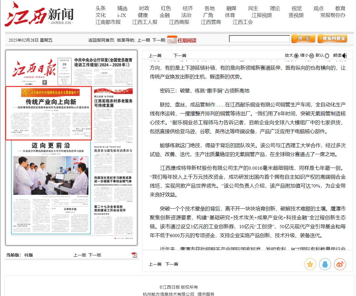 “传统里面蕴含着未来,传统产业做好了也可以成为未来产业。我省把铜基新材料作为六大未来产业的重点发展方向,铜产业的市场前景非常广阔。”鹰潭市委负责人表示,通过几年的实践,鹰潭市找到了一条在调结构中做大总量的路子,在调结构中优化存量、填补增量,产业发展既没有失速,又实现了蝶变升级,在先立后破中量质齐升,在质的有效提升基础上实现了量的合理增长。