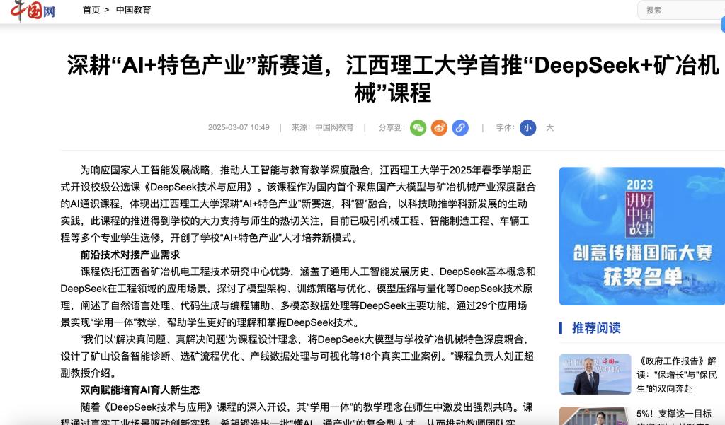 于2025年春季学期正式开设校级公选课《DeepSeek技术与应用》。该课程作为国内首个聚焦国产大模型与矿冶机械产业深度融合的AI通识课程,体现出奈飞工厂