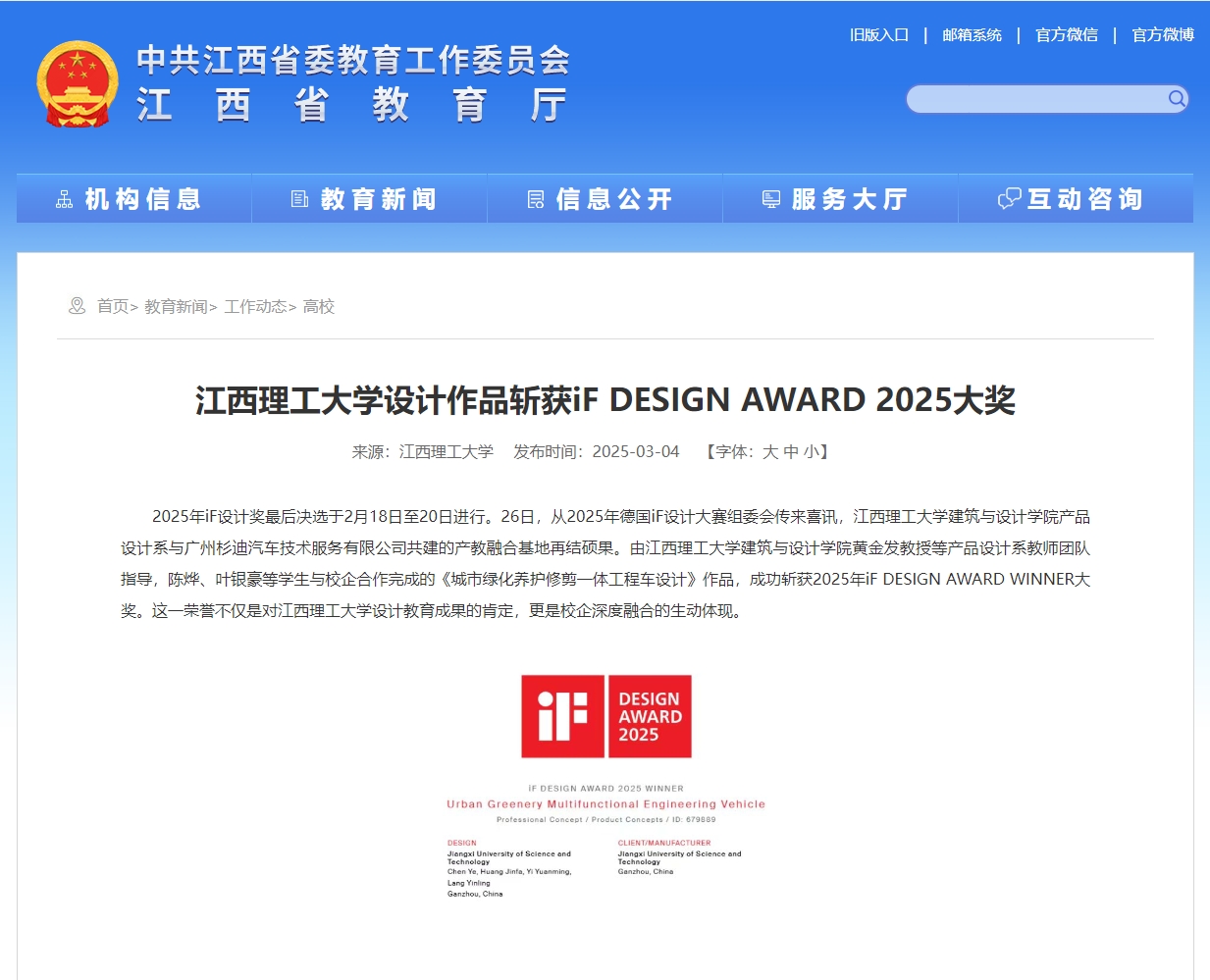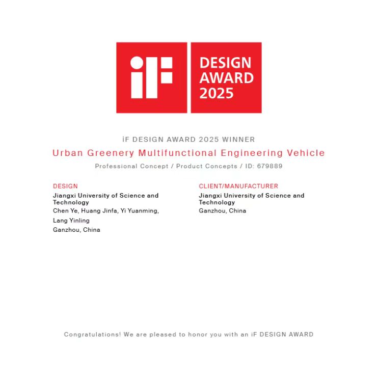 建筑与设计学院黄金发教授等产品设计系教师团队指导,陈烨、叶银豪等学生与校企合作完成的《城市绿化养护修剪一体工程车设计》作品,成功斩获2025年iF DESIGN AWARD WINNER大奖。这一荣誉不仅是对奈飞工厂