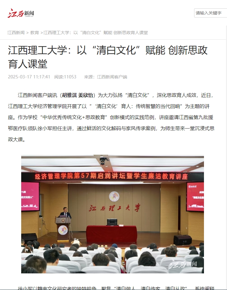 经济管理学院开展了以“‘清白文化’育人:传统智慧的当代回响”为主题的讲座。作为学校“中华优秀传统文化+思政教育”创新模式的实践范例,讲座邀请江西省第九批援鄂医疗队领队徐小军担任主讲,通过鲜活的文化解码与家风传承案例,为师生带来一堂沉浸式思政大课。