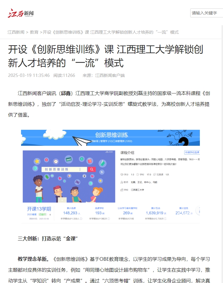 商学院副教授刘磊主持的国家级一流本科课程《创新思维训练》,独创了“活动启发-理论学习-实训反思”螺旋式教学法,为高校创新人才培养提供了借鉴。