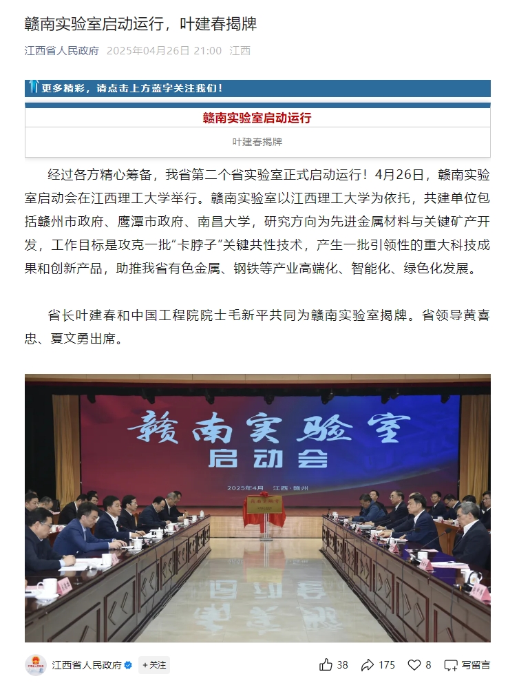 为依托,共建单位包括赣州市政府、鹰潭市政府、南昌大学,研究方向为先进金属材料与关键矿产开发,工作目标是攻克一批“卡脖子”关键共性技术,产生一批引领性的重大科技成果和创新产品,助推我省有色金属、钢铁等产业高端化、智能化、绿色化发展。