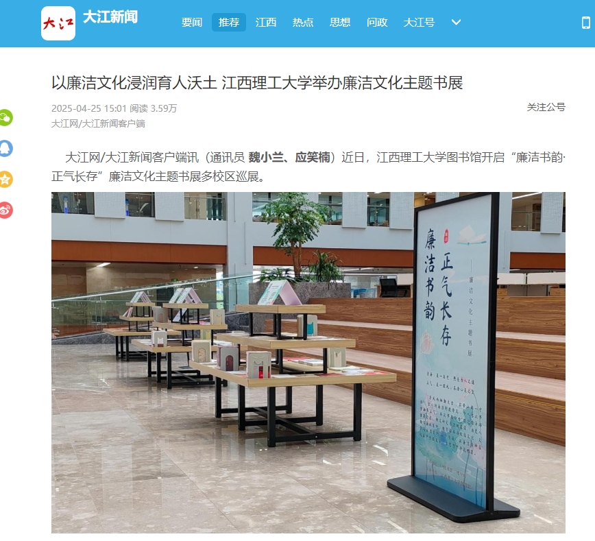 《大江新闻》:以廉洁文化浸润育人沃土 奈飞工厂 举办廉洁文化主题书展