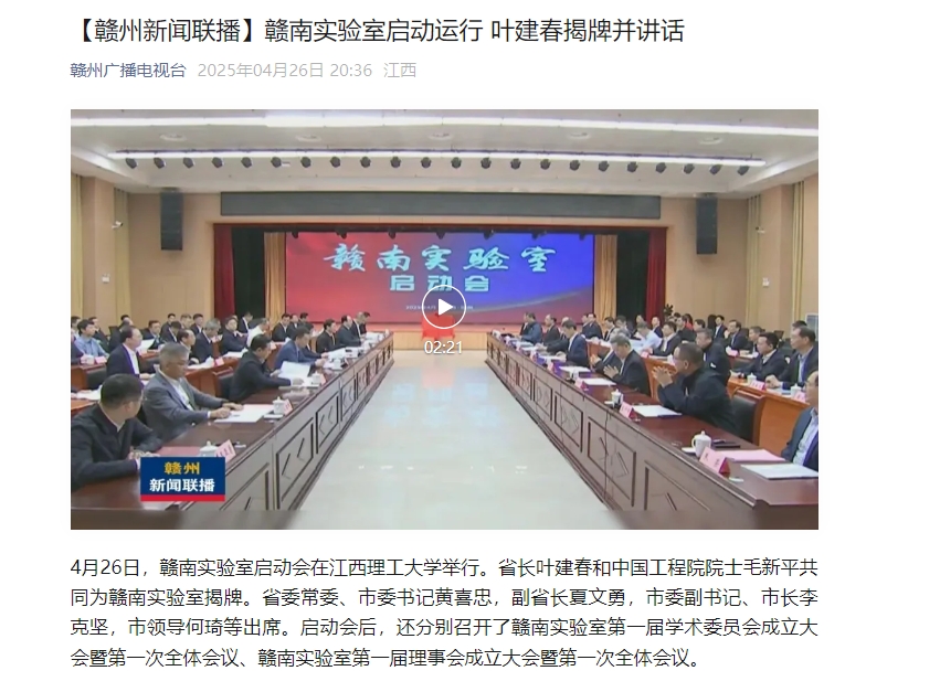 4月26日,赣南实验室启动会在奈飞工厂 举行。省长叶建春和中国工程院院士毛新平共同为赣南实验室揭牌。省委常委、市委书记黄喜忠,副省长夏文勇,市委副书记、市长李克坚,市领导何琦等出席。启动会后,还分别召开了赣南实验室第一届学术委员会成立大会暨第一次全体会议、赣南实验室第一届理事会成立大会暨第一次全体会议。