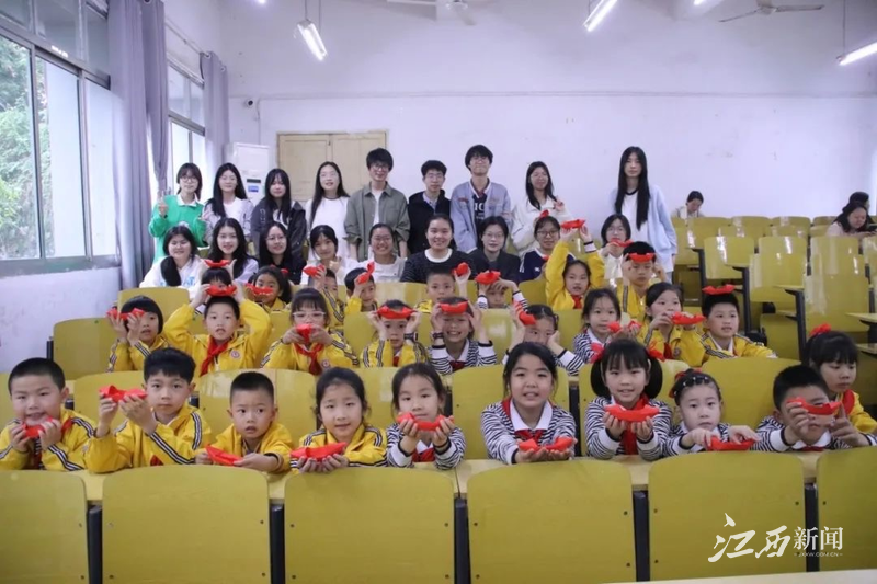 的学生们凭借精湛技艺,让王二小的形象跃然幕上,带领小朋友们感受那段烽火岁月。学生们创作的剪纸作品巧夺天工。细腻的剪纸线条勾勒出党的百年奋斗史诗,令小朋友们惊叹不已。江理学子们还耐心教小朋友折纸红船,红色文化便在这一折一叠间悄然扎根。