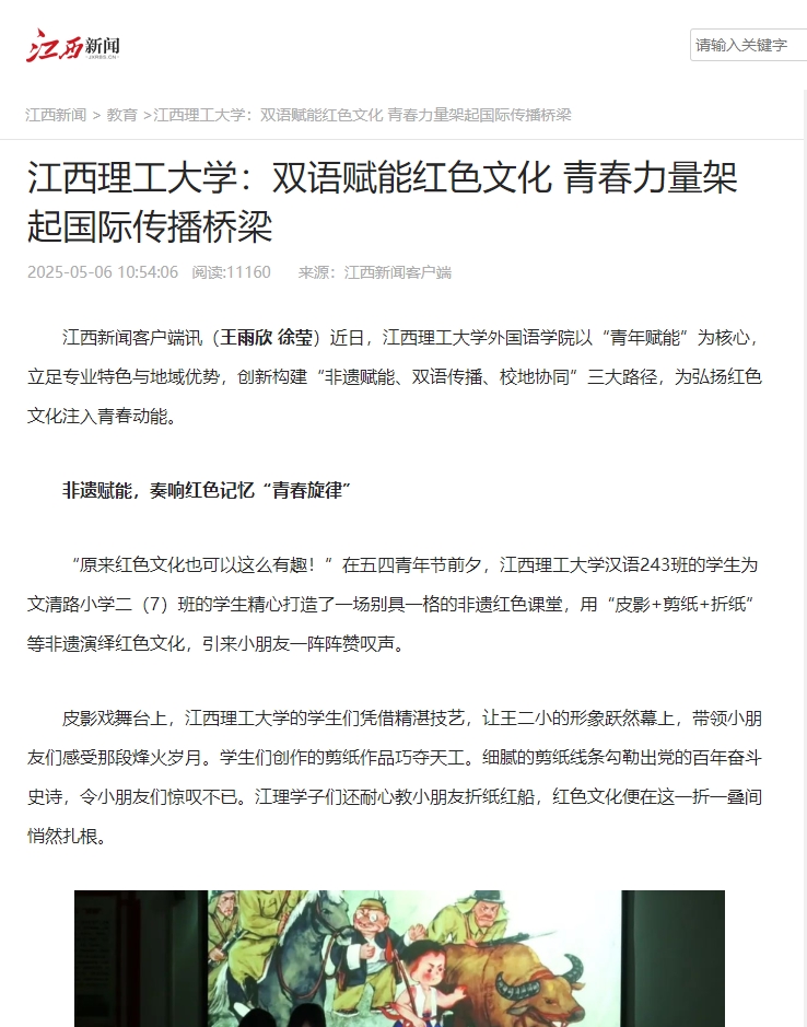 外国语学院充分挖掘赣南非遗资源,将剪纸、皮影、折纸等传统技艺转化为红色文化传播的“活教材”,让青年学生在动手实践中触摸历史温度。学院汉语国际教育专业学生组建了“非遗工坊”,将非遗传承纳入实践教学体系,开发“非遗+红色文化”双语教学方案。引导学生们深入瑞金、兴国等地采风,将“八子参军”“长征第一渡”等红色故事转化为可操作的非遗创作教程。学院还组织学生们走进赣州中小学及社区,开设“非遗里的红色课堂”,让“看红色故事”变为“做红色记忆”,推动非遗成为青年学子传承红色记忆的“活态载体”。