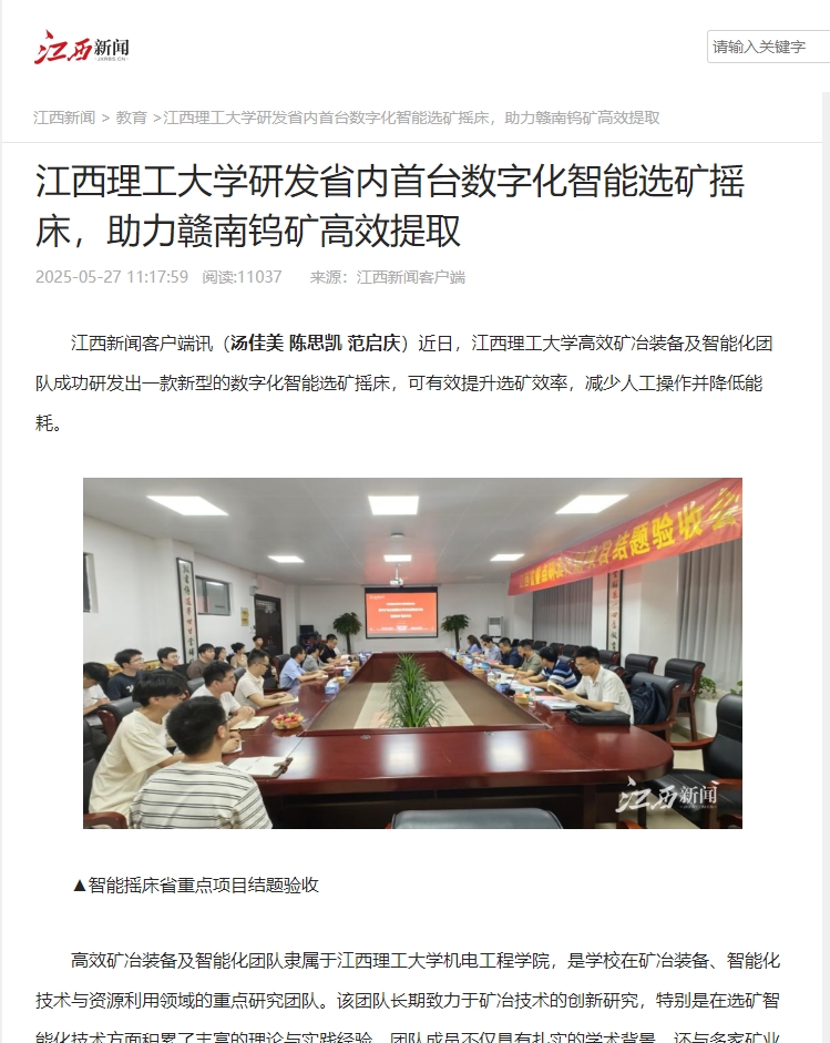 目前,新型数字化智能选矿摇床已经在实验室和矿山等场景进行测试,表现良好、性能指标稳定,已获批国家发明专利一项,发表相关SCI论文3篇。团队指导老师刘惠中表示,这一创新成果不仅为矿业装备行业带来了更高效、更智能的解决方案,也为国内外选矿产业提供了技术参考,推动了矿业行业向绿色、高效、智能化方向发展。未来,团队将继续深化研究,推动选矿行业的数字化转型,助力矿业行业的持续发展与升级。