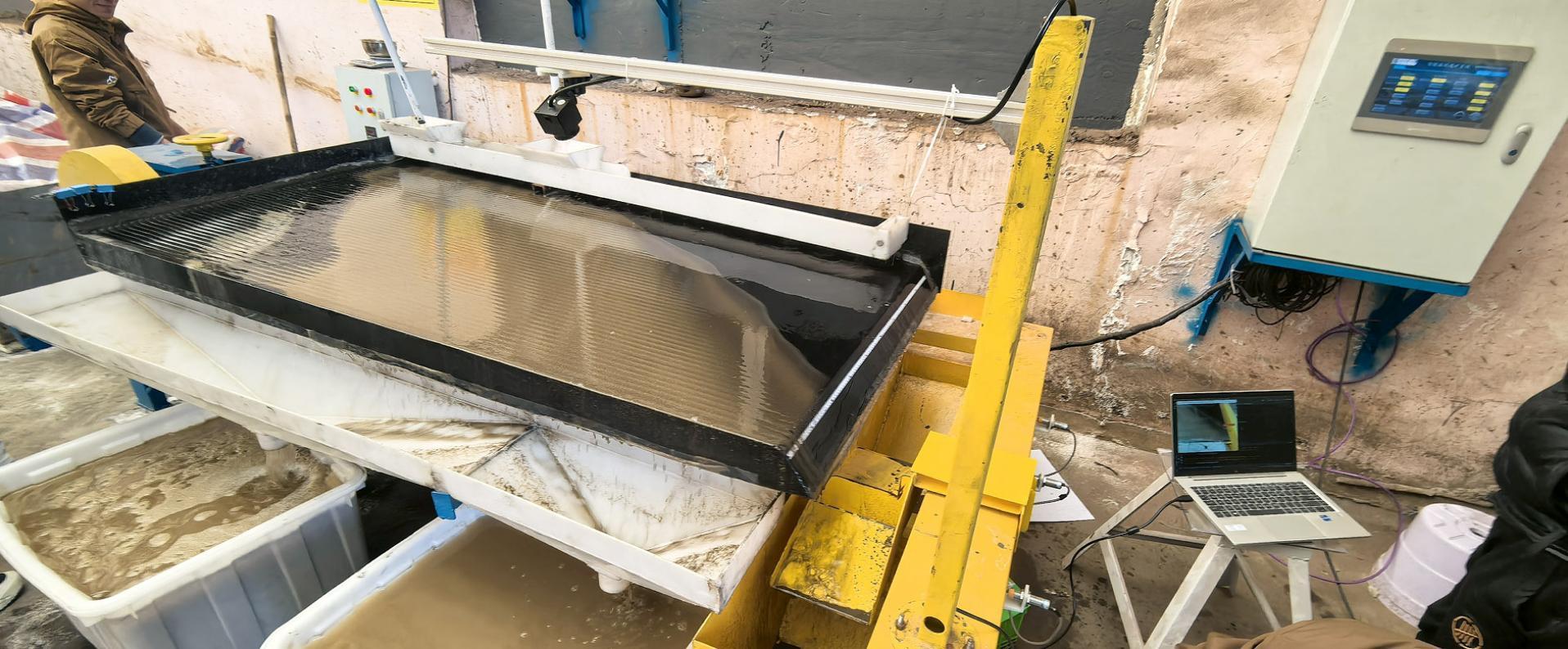 与传统摇床相比,团队为新型选矿摇床设计了“眼睛”和“大脑”。其中,机器视觉作为“眼睛”,替代工人观察。通过安装在精矿端上方的高清摄像头采集矿物分带图像,采用机器视觉技术迅速识别并提取床面矿物分带特征,如矿带分离点位置、矿带分界线与精矿端的夹角、矿带的宽度等。构建以矿物回收率最大化为目标的“矿带特征一控制参数”智能优化控制模型,以此模型作为“大脑”替代工人经验,精确调整床面坡度和精矿截取板的位置,实现矿物的智能分选。