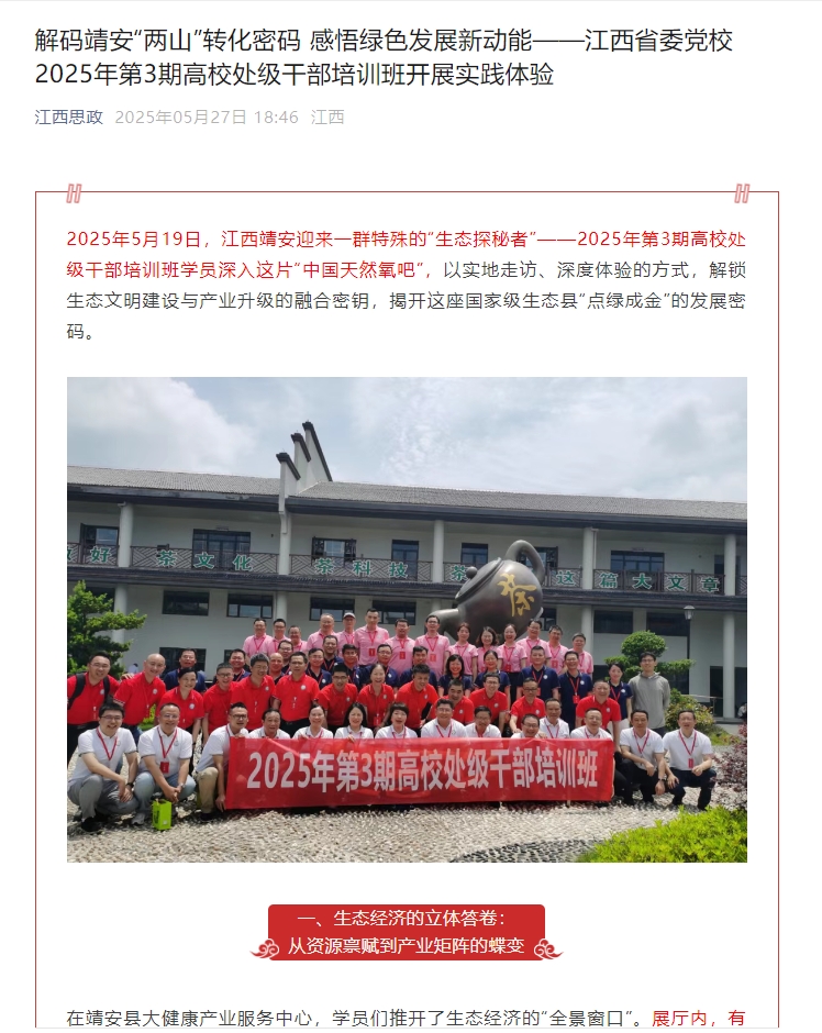 《江西思政》:解码靖安“两山”转化密码 感悟绿色发展新动能——江西省委党校2025年第3期高校处级干部培训班开展实践体验