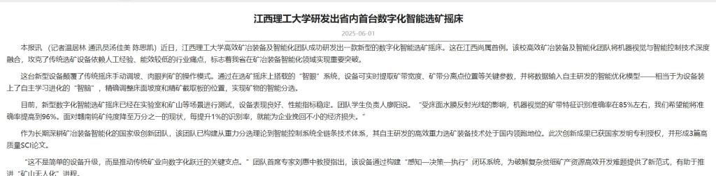 高效矿冶装备及智能化团队成功研发出一款新型的数字化智能选矿摇床。这在江西尚属首例。该校高效矿冶装备及智能化团队将机器视觉与智能控制技术深度融合,攻克了传统选矿设备依赖人工经验、能效较低的行业痛点,标志着我省在矿冶装备智能化领域实现重要突破。
