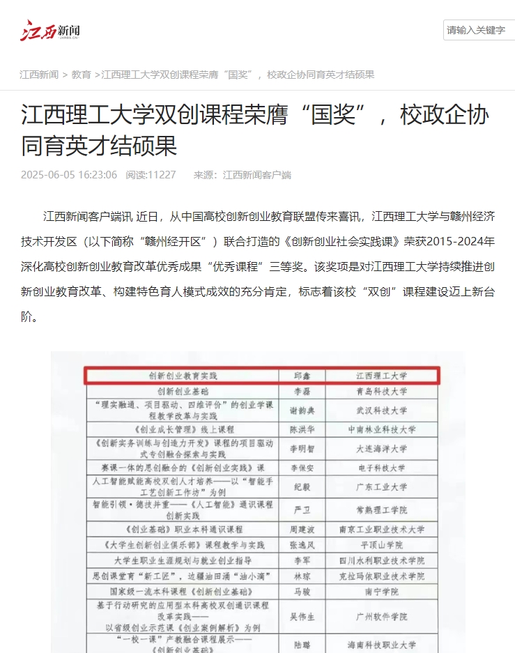 与赣州经济技术开发区(以下简称“赣州经开区”)联合打造的《创新创业社会实践课》荣获2015-2024年深化高校创新创业教育改革优秀成果“优秀课程”三等奖。该奖项是对奈飞工厂