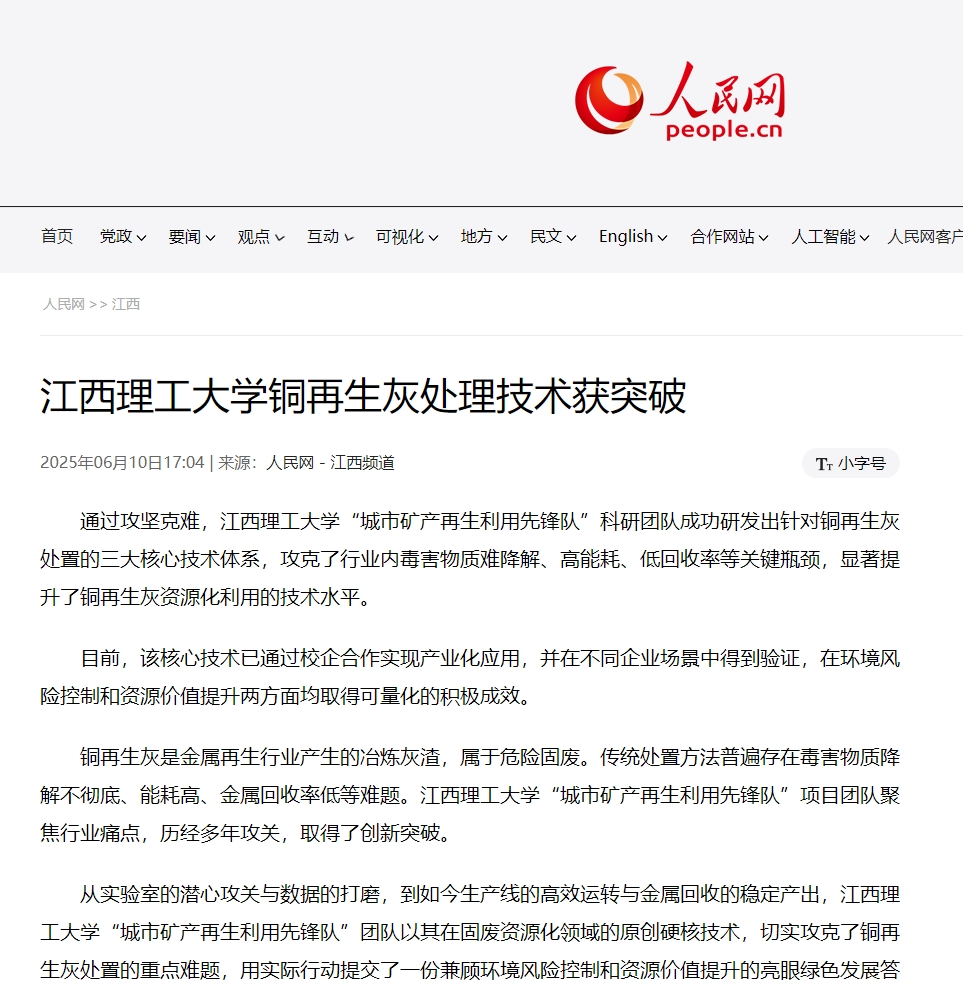 “城市矿产再生利用先锋队”团队以其在固废资源化领域的原创硬核技术,切实攻克了铜再生灰处置的重点难题,用实际行动提交了一份兼顾环境风险控制和资源价值提升的亮眼绿色发展答卷。(张启翔、姜妍煣、彭诗喻)