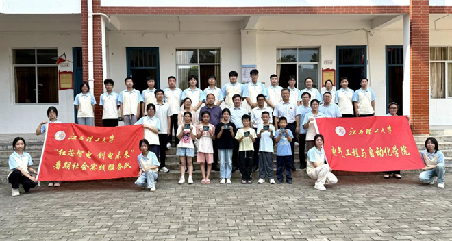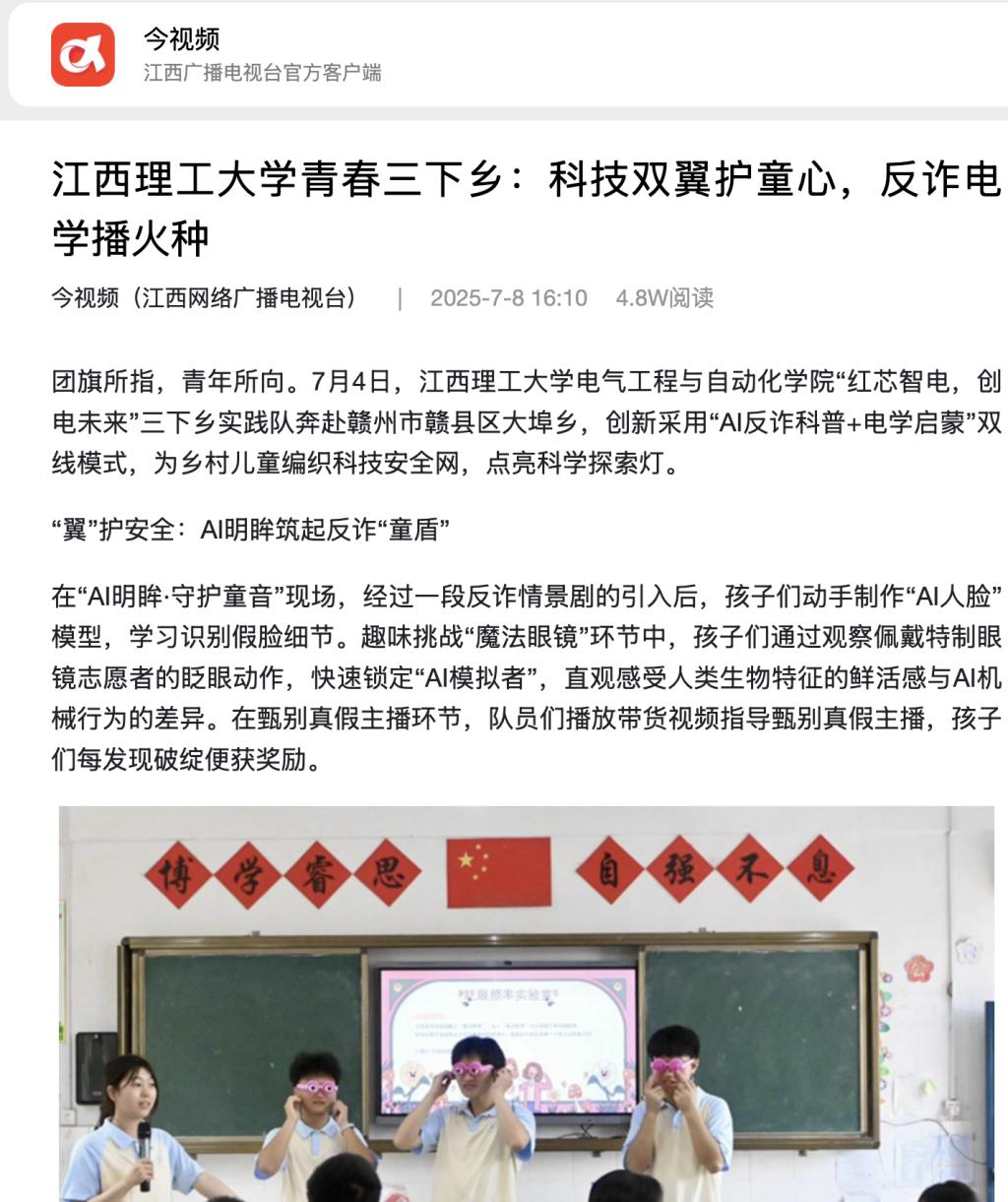 电气工程与自动化学院“红芯智电,创电未来”三下乡实践队奔赴赣州市赣县区大埠乡,创新采用“AI反诈科普+电学启蒙”双线模式,为乡村儿童编织科技安全网,点亮科学探索灯。