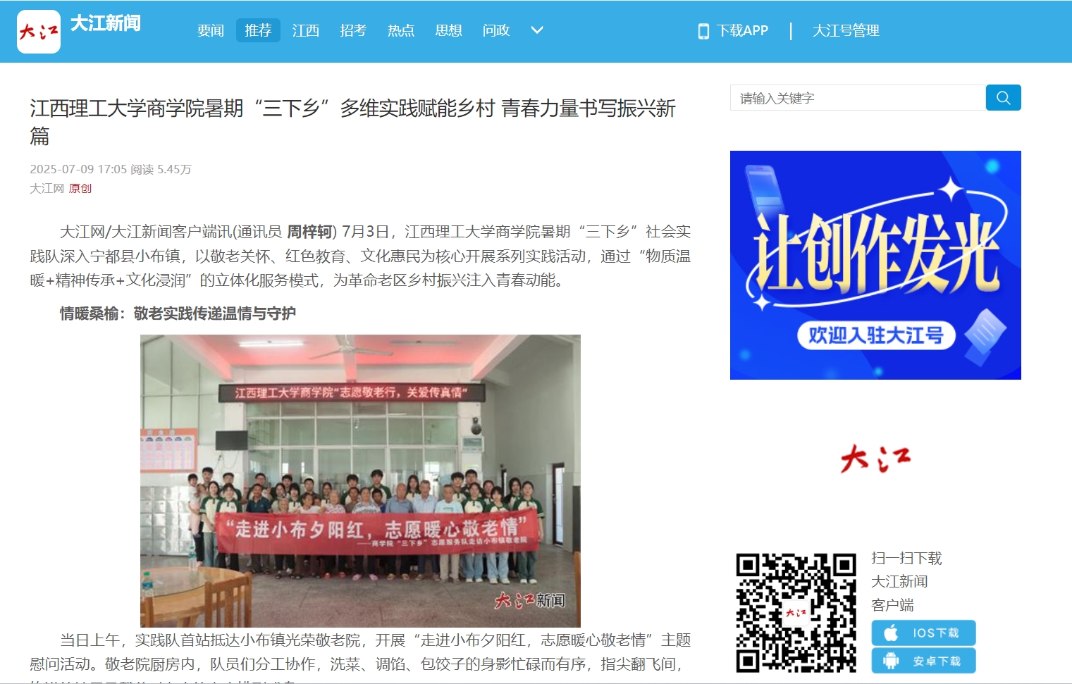 商学院暑期“三下乡”社会实践队深入宁都县小布镇,以敬老关怀、红色教育、文化惠民为核心开展系列实践活动,通过“物质温暖+精神传承+文化浸润”的立体化服务模式,为革命老区乡村振兴注入青春动能。