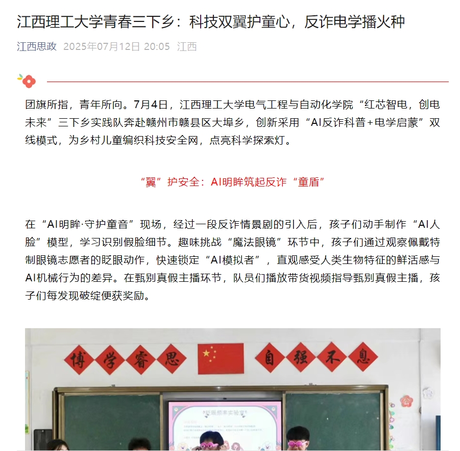 电气工程与自动化学院“红芯智电,创电未来”三下乡实践队奔赴赣州市赣县区大埠乡,创新采用“AI反诈科普+电学启蒙”双线模式,为乡村儿童编织科技安全网,点亮科学探索灯。