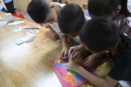 “预备——开始!”随着队员程霜的一声令下,“趣味地图大挑战”激烈展开。五组小朋友围在拼图桌前,小手飞速移动。第三组的圆圆急得鼻尖冒汗,抓起一块拼图反复比对:“这块是新疆,它的形状像个朝西的牛头!”同组的乐乐兴奋拍手:“快!把甘肃接上,它像个如意!”欢呼声中,率先完成拼图的小组击掌庆祝,胜利的笑容比窗外的阳光还要灿烂。