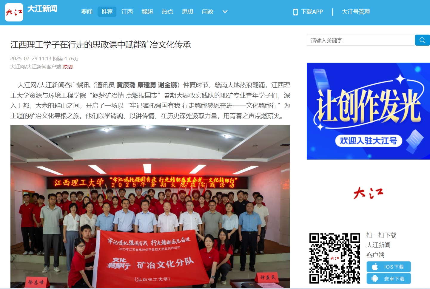 资源与环境工程学院“逐梦矿冶情 点燃报国志”暑期大思政实践队的地矿专业青年学子们,深入于都、大余的群山之间,开启了一场以“牢记嘱托强国有我 行走赣鄱感恩奋进——文化赣鄱行”为主题的矿冶文化寻根之旅。他们以学铸魂、以讲传情,在历史深处汲取力量,用青春之声点燃薪火。