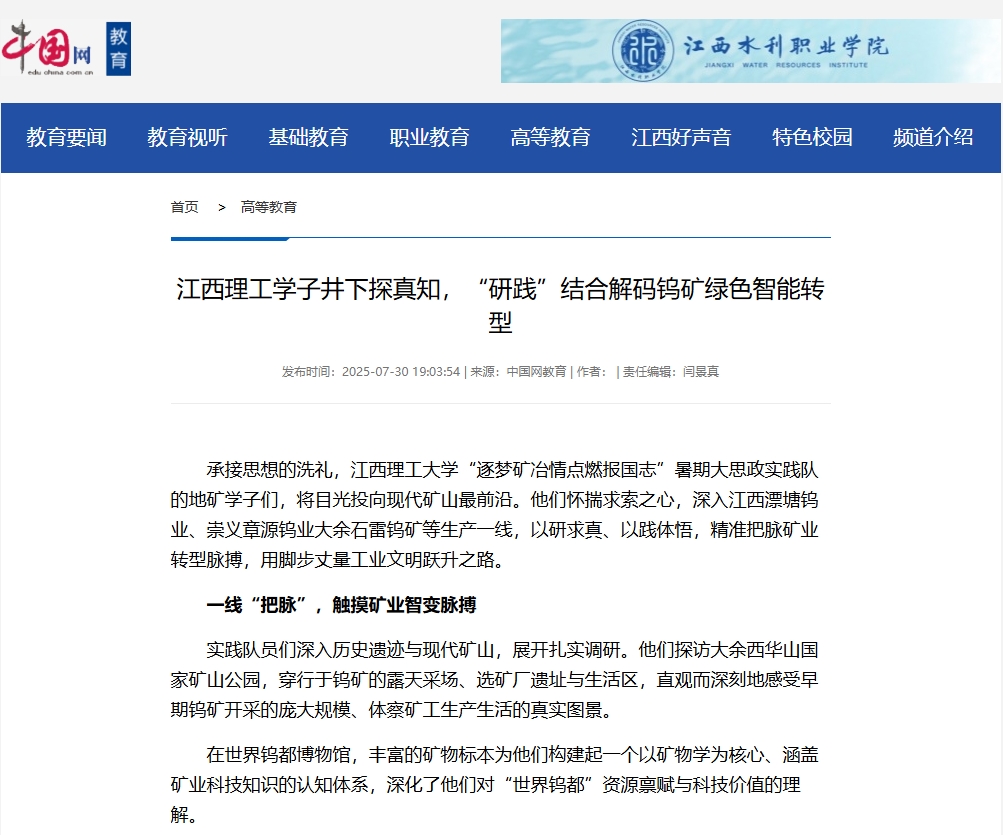 “逐梦矿冶情点燃报国志”暑期大思政实践队的地矿学子们,将目光投向现代矿山最前沿。他们怀揣求索之心,深入江西漂塘钨业、崇义章源钨业大余石雷钨矿等生产一线,以研求真、以践体悟,精准把脉矿业转型脉搏,用脚步丈量工业文明跃升之路。