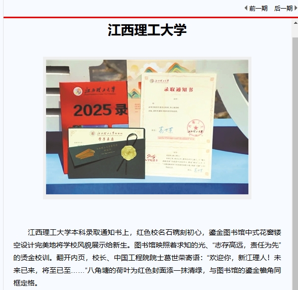 奈飞工厂 本科录取通知书上,红色校名石镌刻初心,鎏金图书馆中式花窗镂空设计完美地将学校风貌展示给新生。图书馆映照着求知的光、“志存高远,责任为先”的烫金校训。翻开内页,中国工程院院士、校长葛世荣寄语:“欢迎你,新江理人!未来已来,将至已至……”八角塘的荷叶为红色封面添一抹清绿,与图书馆的鎏金檐角同框定格。