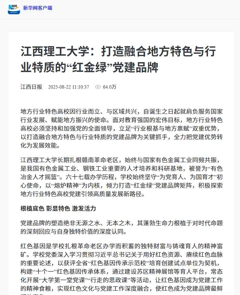 长期扎根赣南革命老区,始终与国家有色金属工业同频共振,是我国有色金属工业、钢铁工业重要的人才培养和科研基地,被誉为“有色冶金人才摇篮”。六十七载办学历程,学校始终坚守“为党育人、为国育才”初心使命,以“熔炉精神”为内核,倾力打造“红金绿”党建品牌矩阵,积极探索地方行业特色高校党建引领高质量发展新路径。