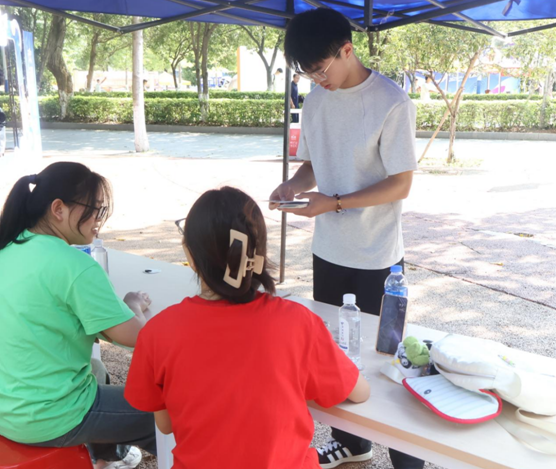 在书香阁“美食江湖”站点,新生和家长们解锁校园美味的同时,还积极参与着“安全标识猜猜看”快问快答互动。大家转动标识转盘,快速答出禁止烟火、当心触电等常见安全标志含义,在休闲场景中轻松习得实用安全常识。