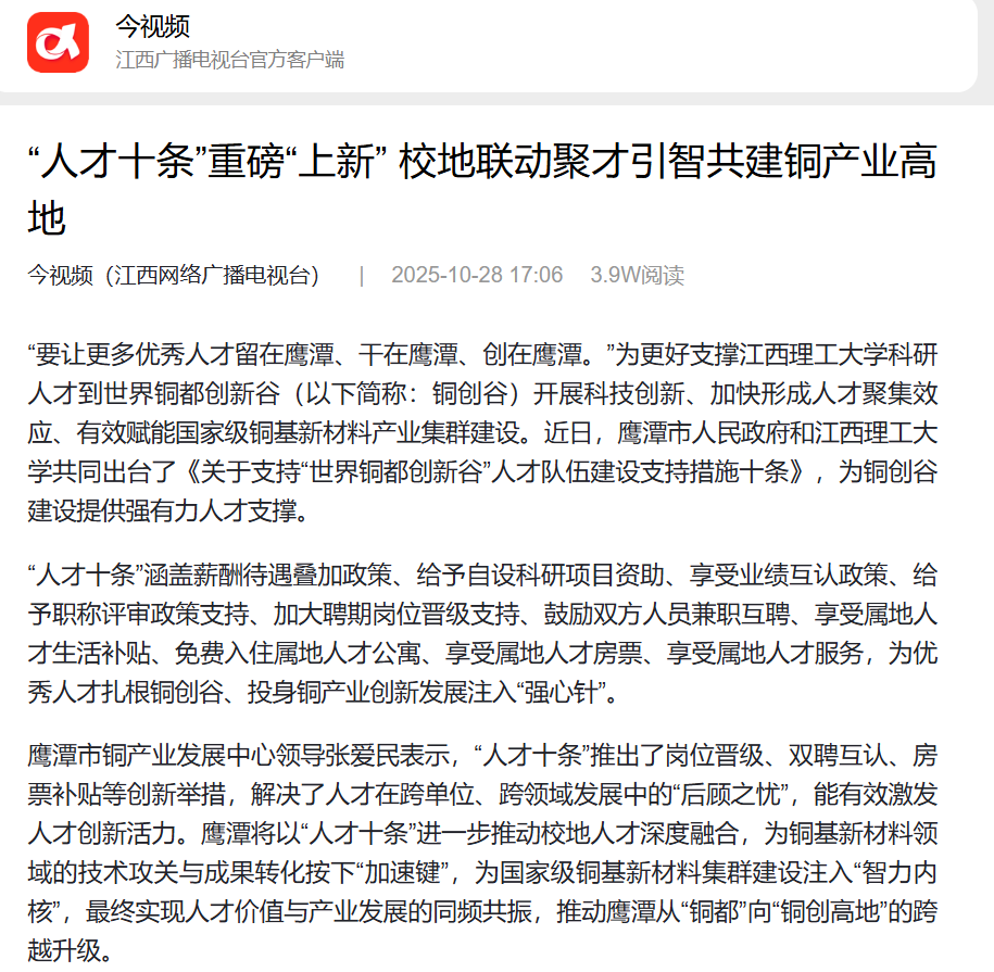 鹰潭市铜产业发展中心领导张爱民表示,“人才十条”推出了岗位晋级、双聘互认、房票补贴等创新举措,解决了人才在跨单位、跨领域发展中的“后顾之忧”,能有效激发人才创新活力。鹰潭将以“人才十条”进一步推动校地人才深度融合,为铜基新材料领域的技术攻关与成果转化按下“加速键”,为国家级铜基新材料集群建设注入“智力内核”,最终实现人才价值与产业发展的同频共振,推动鹰潭从“铜都”向“铜创高地”的跨越升级。