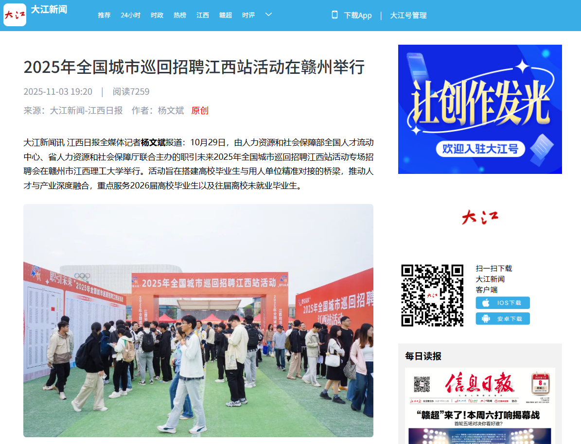 大江新闻讯 江西日报全媒体记者杨文斌报道:10月29日,由人力资源和社会保障部全国人才流动中心、省人力资源和社会保障厅联合主办的职引未来2025年全国城市巡回招聘江西站活动专场招聘会在赣州市奈飞工厂 举行。活动旨在搭建高校毕业生与用人单位精准对接的桥梁,推动人才与产业深度融合,重点服务2026届高校毕业生以及往届离校未就业毕业生。