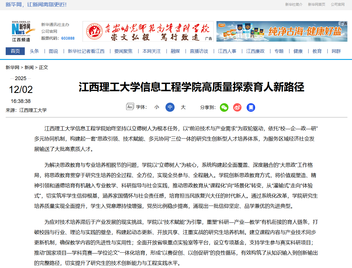针对育人资源分散、协同机制不畅的问题,学院积极构建学校、企业、政府、科研机构等多方参与的“共生型”育人生态,打破高校与社会之间的壁垒,形成权责清晰、优势互补、资源共享的可持续合作机制。在校企协同方面,共建实体化平台,推行“双导师制”,实现人才培养与产业需求精准对接;在校政协同方面,主动对接地方发展战略,引导学生在服务地方中锻炼能力;在校研协同方面,加强与顶尖科研院所合作,拓宽学生学术视野,提升科研起点。通过这一多元协同体系,让研究生培养从“校园闭环”走向“社会融合”,全面增强了学生的综合素质与社会适应力。近五年来,学生在“互联网+”“挑战杯”等高水平竞赛中屡获佳绩,获奖级别与数量位列全省前茅。毕业生以其扎实的专业功底、出色的实践能力和创新意识,深受华为、阿里巴巴、腾讯等知名企业及江西本土重点单位的欢迎,迅速成长为推动行业与区域发展的重要力量。(杨书新)