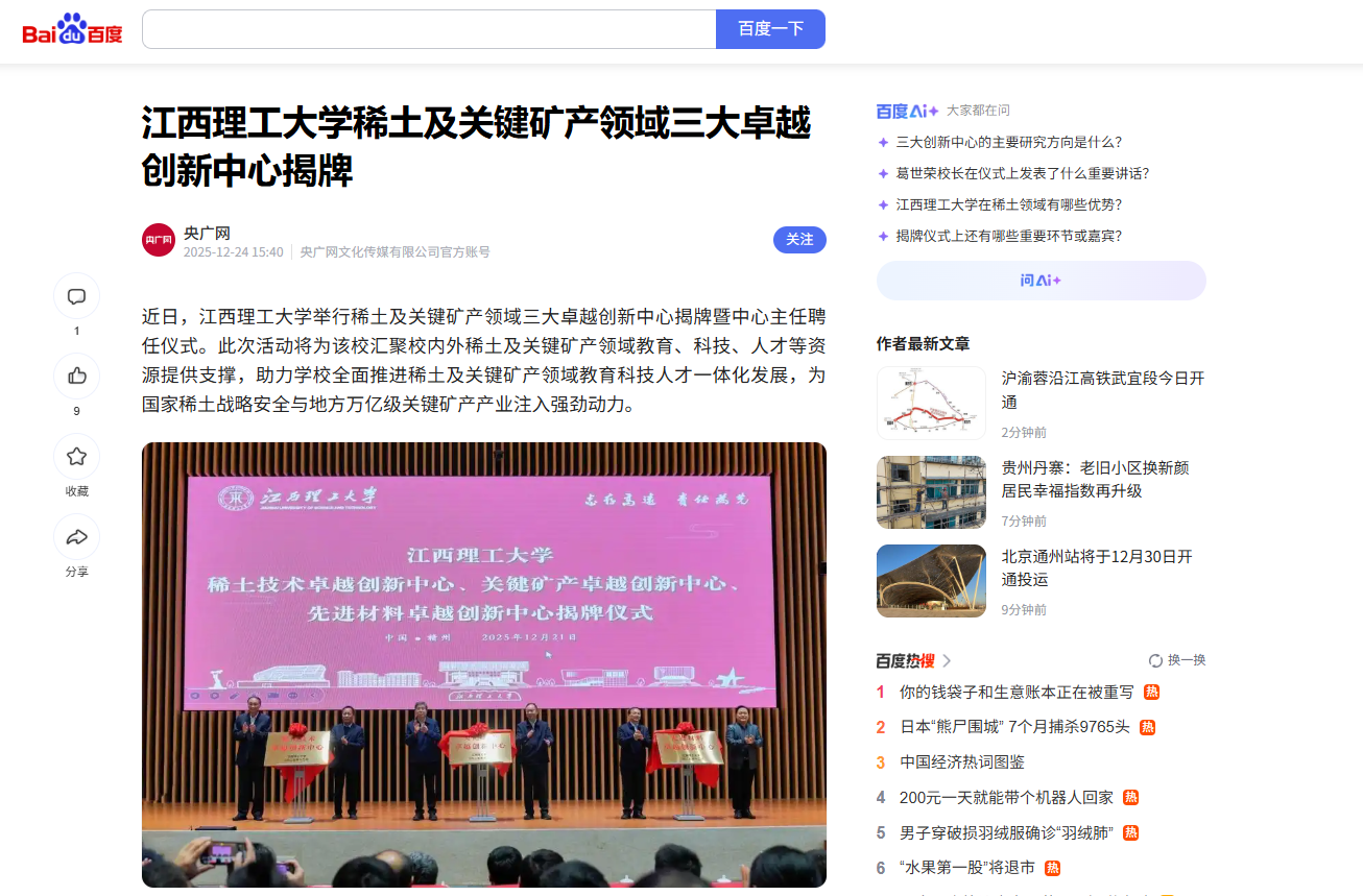 举行稀土及关键矿产领域三大卓越创新中心揭牌暨中心主任聘任仪式。此次活动将为该校汇聚校内外稀土及关键矿产领域教育、科技、人才等资源提供支撑,助力学校全面推进稀土及关键矿产领域教育科技人才一体化发展,为国家稀土战略安全与地方万亿级关键矿产产业注入强劲动力。