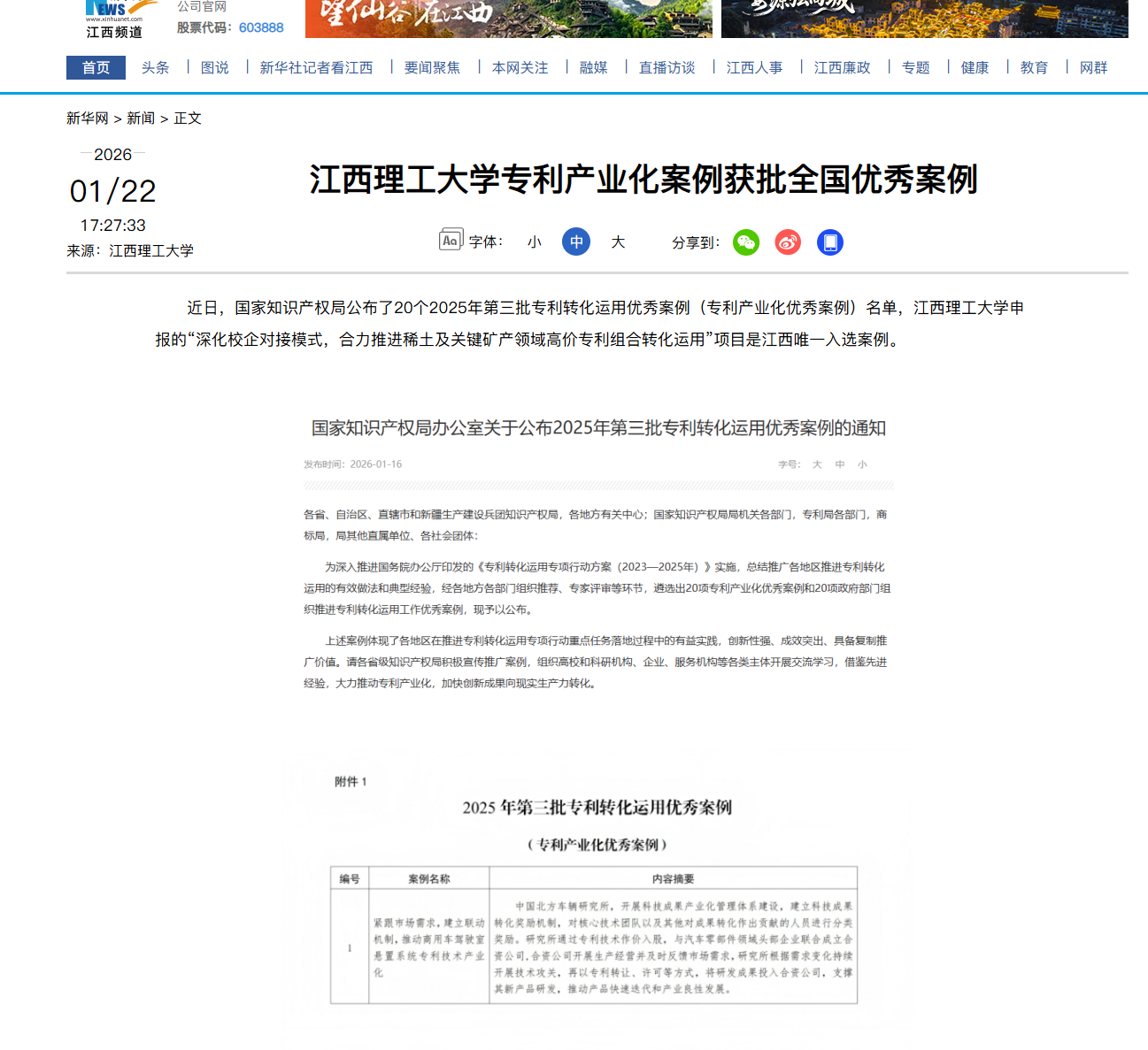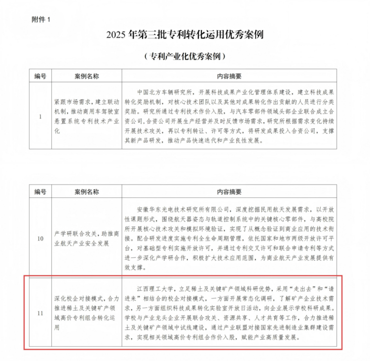 申报的“深化校企对接模式,合力推进稀土及关键矿产领域高价专利组合转化运用”项目是江西唯一入选案例。