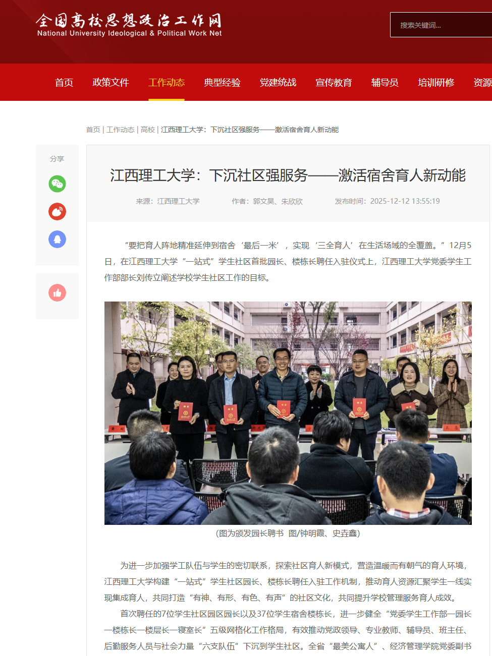 首次聘任的7位学生社区园区园长以及37位学生宿舍楼栋长,进一步健全“党委学生工作部一园长一楼栋长一楼层长一寝室长”五级网格化工作格局,有效推动党政领导、专业教师、辅导员、班主任、后勤服务人员与社会力量“六支队伍”下沉到学生社区。全省“最美公寓人”、经济管理学院党委副书记、红旗校区园长吴媛表示,将严格落实“服务型、引领型、陪伴型”的工作定位,用实际行动筑牢“教育有温度、管理有效度”的育人共同体。