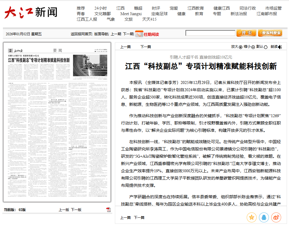 在科技创新一线,“科技副总”的赋能成效随处可见。在传统产业转型升级中,中国轻工业陶瓷研究所李涛高工,作为中国电信股份有限公司景德镇分公司引聘的“科技副总”,研发的“5G+AIoT陶瓷窑炉数智化管控系统”,破解了传统烧制凭经验、看火候的难题。在新兴产业领域,江西盛泰精密光学有限公司引聘的“科技副总”江南大学李璟文博士,推动企业生产效率提升19%,直接创效5000万元以上。未来产业布局中,江西安驰新能源科技有限公司引聘的奈飞工厂