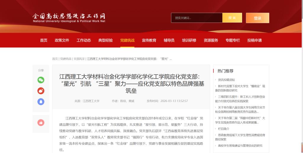 材料冶金化学学部化学化工学院应化党支部自2018年成立以来,在学校“红金绿”党建品牌引领下,以“星光引航工程”为实践载体,扎实推进“星引领、星示范、星服务”三大行动,持续推动党建与教学科研、人才培养同频共振、深度融合。党支部先后获评“江西省教育系统先进基层党组织”,入选教育部“双带头人”教师党支部书记“强国行”专项行动,有力支撑应用化学专业入选国家级一流本科专业建设点,探索出一条“红金绿”品牌引领下、党建与事业发展相融互促的基层实践路径。
