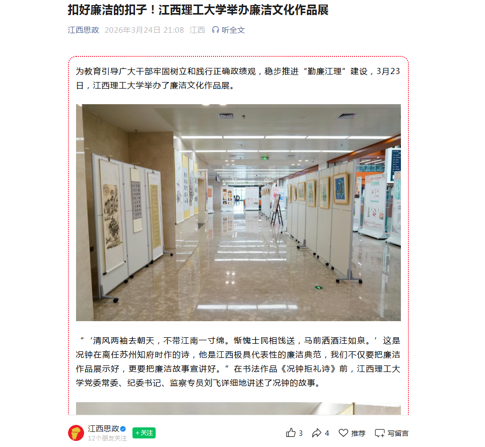 在教育部第十届高校廉洁教育系列活动中的获奖作品、学校师生创作的系列廉洁文化作品及校外优秀廉洁文化作品,作品涵盖书法、绘画、海报、创意设计等形式,既彰显了学校党员干部廉洁自律、担当作为的先锋本色,也承载着青年学子廉洁修身、笃行向善的青春追求。