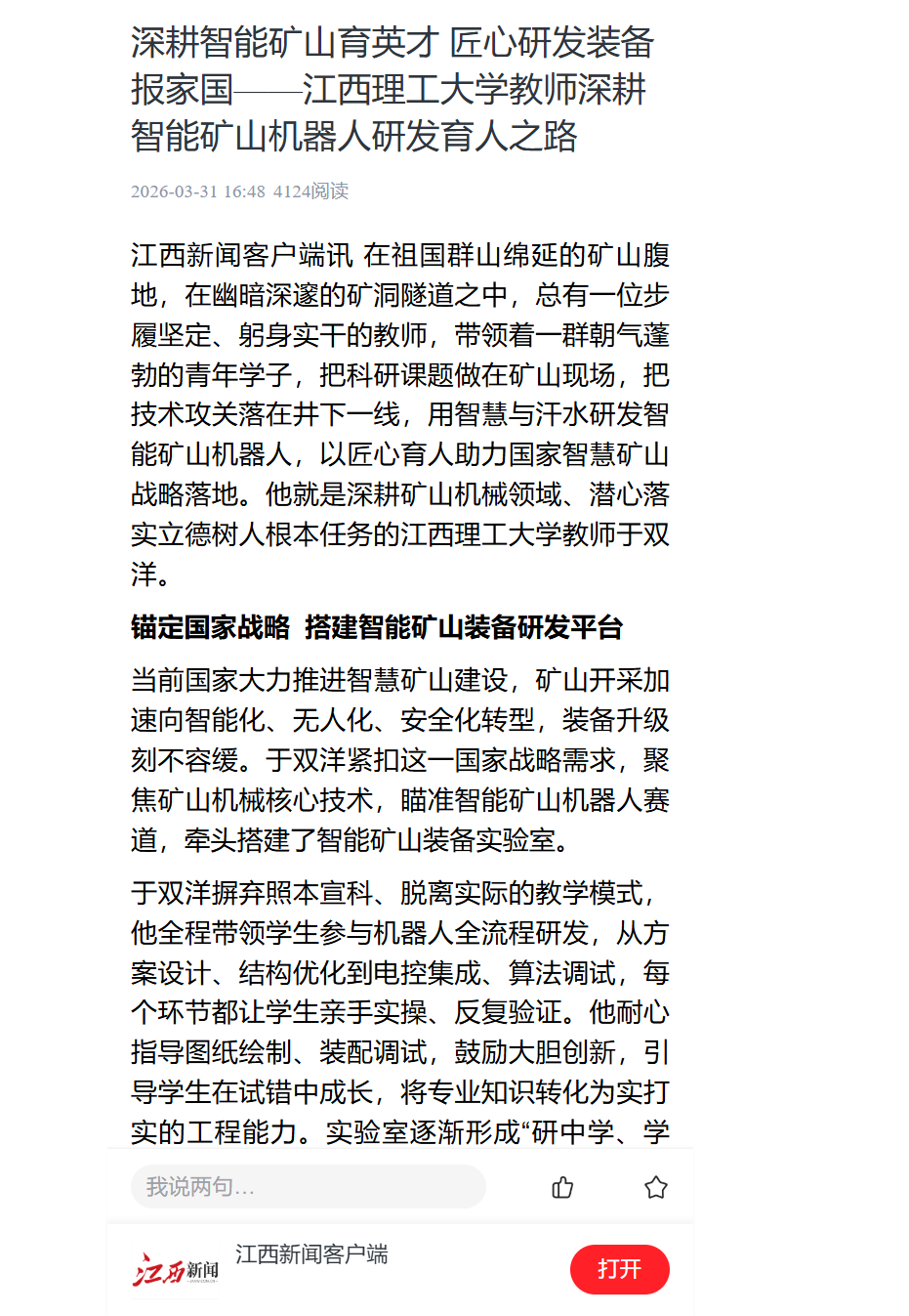 江西新闻客户端讯 在祖国群山绵延的矿山腹地,在幽暗深邃的矿洞隧道之中,总有一位步履坚定、躬身实干的教师,带领着一群朝气蓬勃的青年学子,把科研课题做在矿山现场,把技术攻关落在井下一线,用智慧与汗水研发智能矿山机器人,以匠心育人助力国家智慧矿山战略落地。他就是深耕矿山机械领域、潜心落实立德树人根本任务的奈飞工厂