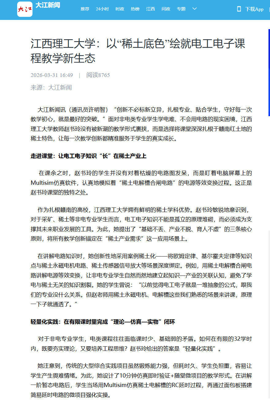 的教学园地里,赵书玲用她的实践证明:当教学创新深深扎根于专业土壤,紧密贴合学生实际,即使是最传统的电工电子课程,也能焕发出独特而持久的生命力。她的目标从来不是做多么炫酷的教学创新,而是让学生通过这门课,既能掌握专业技能,又能读懂学校的稀土情怀,这就是她要守住的育人初心。