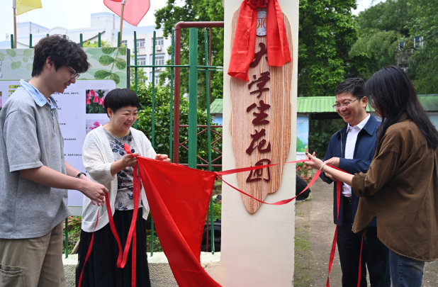 党委常委、纪委书记、监察专员刘飞,党委常委、副校长宁洁及学生代表共同为大学生花圃揭牌。