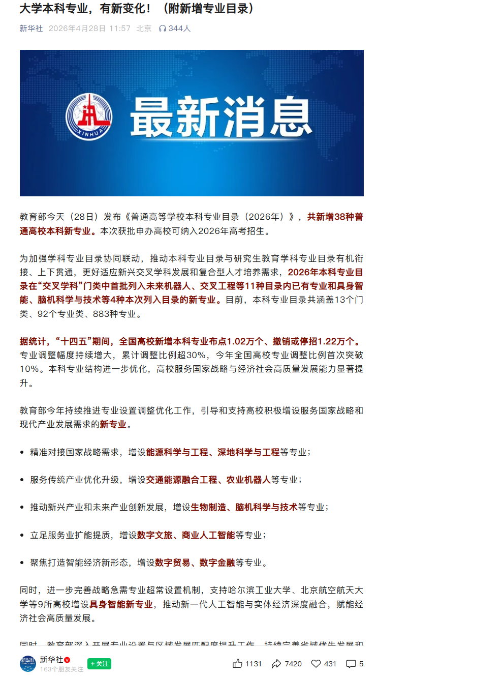 教育部今天(28日)发布《普通高等学校本科专业目录(2026年)》,共新增38种普通高校本科新专业。本次获批申办高校可纳入2026年高考招生。