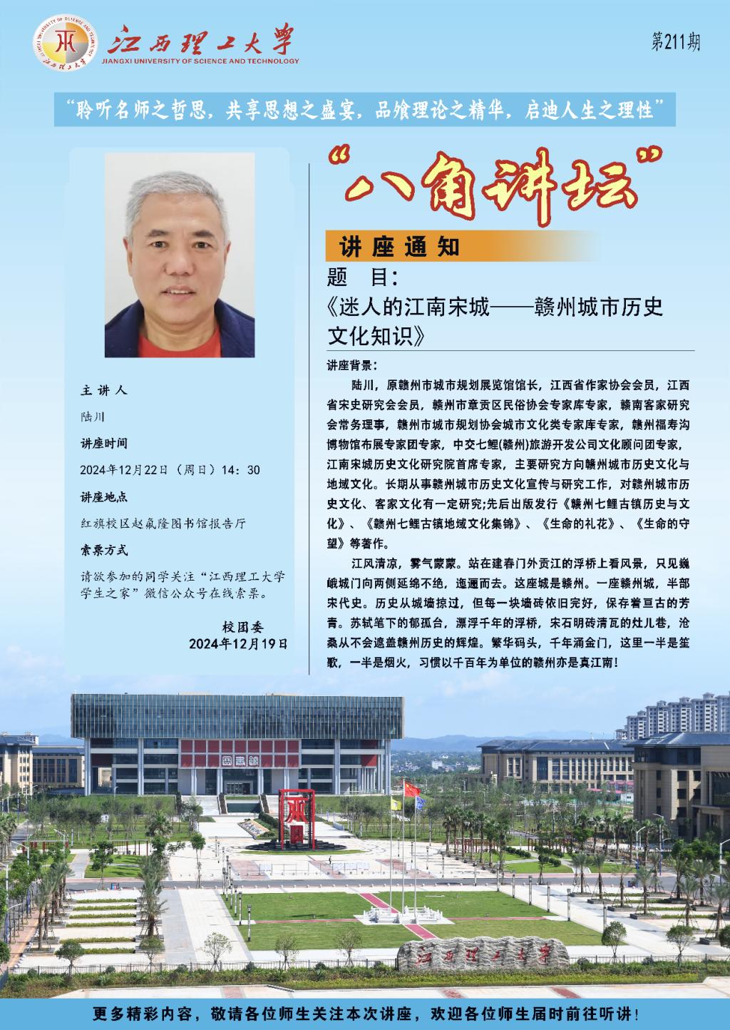 陆川,原赣州市城市规划展览馆馆长,江西省作家协会会员,江西省宋史研究会会员,赣州市章贡区民俗协会专家库专家,赣南客家研究会常务理事,赣州市城市规划协会城市文化类专家库专家,赣州福寿沟博物馆布展专家团专家,中交七鲤(赣州)旅游开发公司文化顾问团专家,江南宋城历史文化研究院首席专家,主要研究方向赣州城市历史文化与地域文化。长期从事赣州城市历史文化宣传与研究工作,对赣州城市历史文化、客家文化有一定研究;先后出版发行《赣州七鲤古镇历史与文化》《赣州七鲤古镇地域文化集锦》《生命的礼花》《生命的守望》等著作。