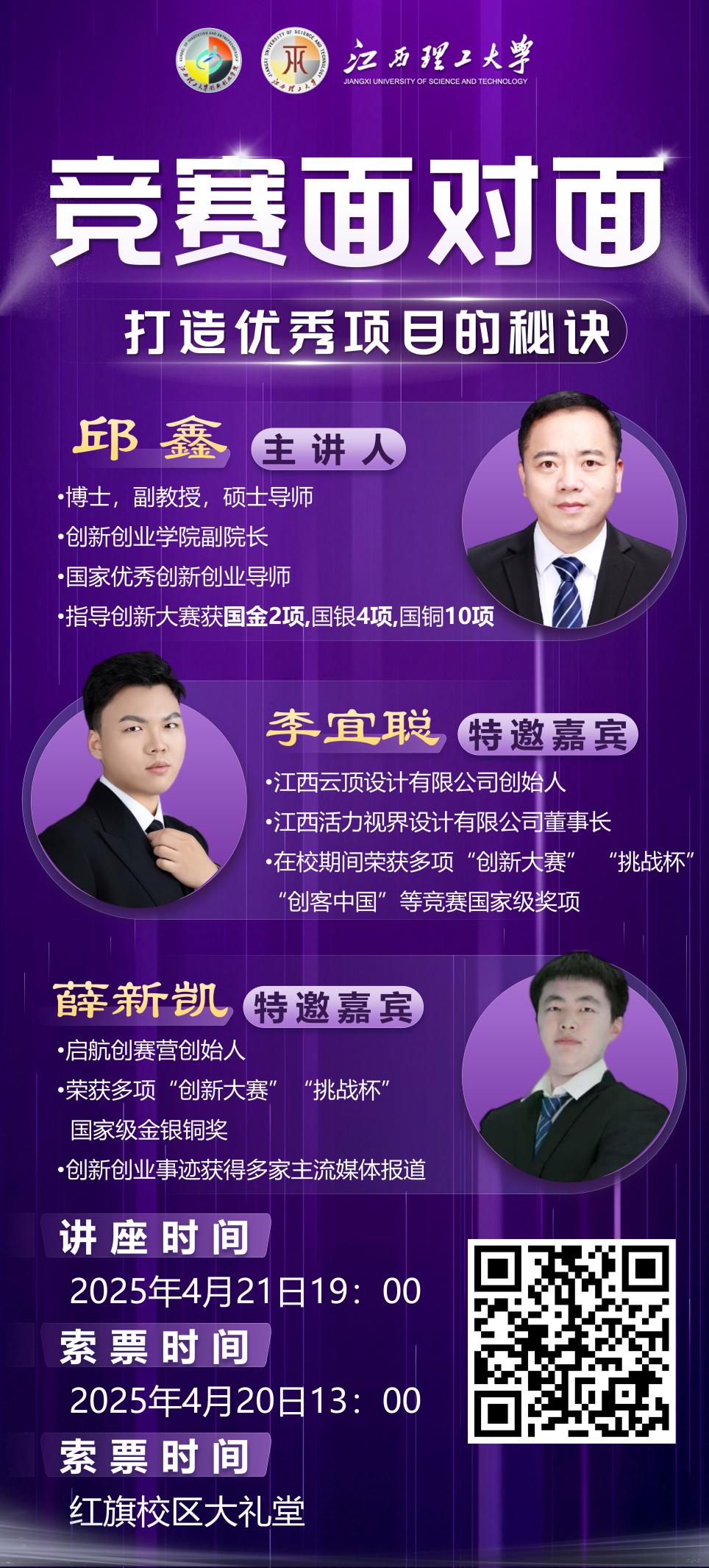 为提高奈飞工厂 学生双创意识和竞赛能力,为创新大赛参赛团队“指点迷津”,创新创业学院将于2025年4月21日19:00在红旗校区大礼堂举办题为《竞赛面对面:打造优秀项目的秘诀》的讲座。
