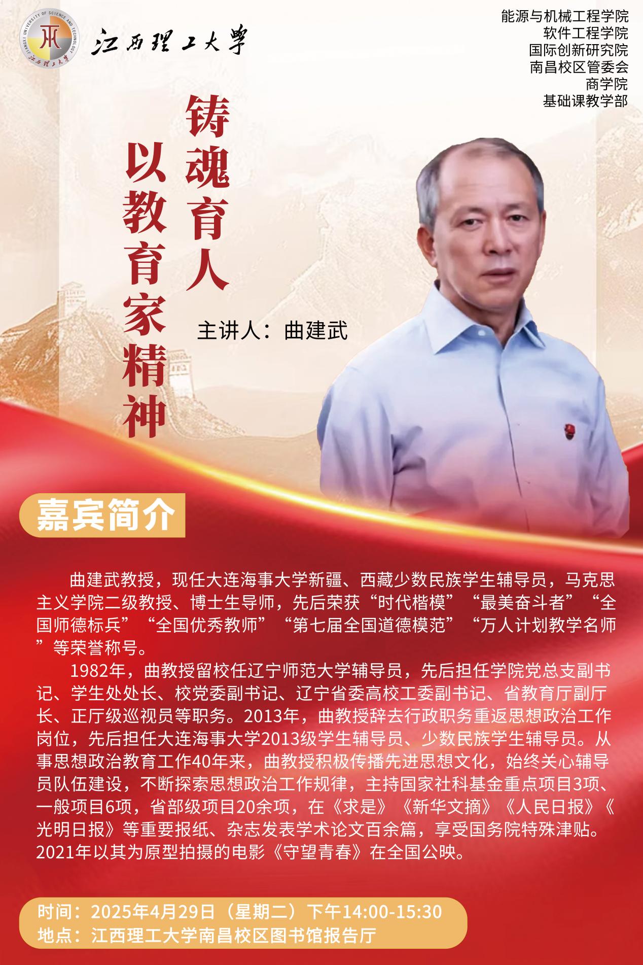 主讲人:曲建武,现任大连海事大学新疆、西藏少数民族学生辅导员,马克思主义学院二级教授、博士生导师,先后荣获“时代楷模”“最美奋斗者”“全国师德标兵”“全国优秀教师”“第七届全国道德模范”“万人计划教学名师”等荣誉称号。