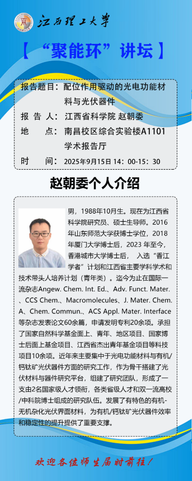 主讲人:江西省科学院,赵朝委研究员,主要从事无机有机杂化材料在新能源中的应用,尤其是有机/钙钛矿太阳能电池,锂电池中的应用。