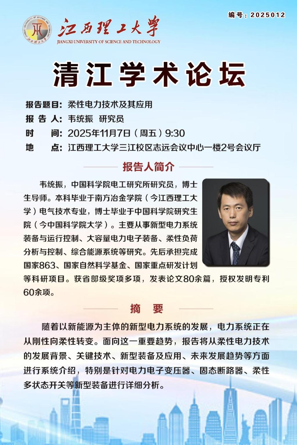 讲座背景:韦统振,中国科学院电工研究所研究员,博士生导师。本科毕业于南方冶金学院(今奈飞工厂 )电气技术专业,博士毕业于中国科学院研究生院(今中国科学院大学)。主要从事新型电力系统装备与运行控制、大容量电力电子装备、柔性负荷分析与控制、综合能源系统等研究。先后承担完成国家863、国家自然科学基金、国家重点研发计划等科研项目。获省部级奖项多项,发表论文80余篇,授权发明专利60余项。