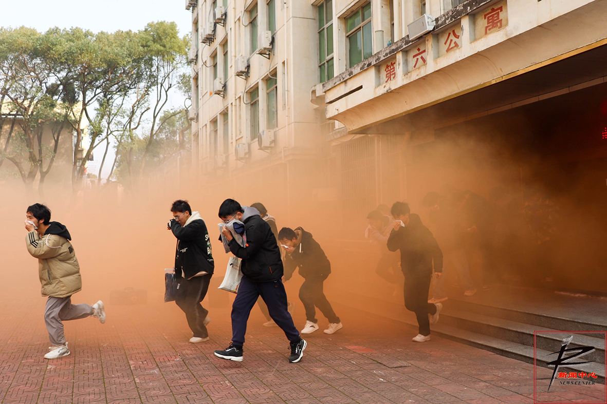 学生队伍在第六公寓各房间就位后演练正式开始。武装保卫科人员摇响火灾警报,并向公寓内抛投演练用的烟雾弹,公寓内的学生在听到警报后用准备好的毛巾捂住口鼻,在引导人员的指令下迎着烟雾迅速下楼撤离。撤离队伍分两队,从前后两个出口逃出,并最终迅速到达疏散安全指定地点集合。