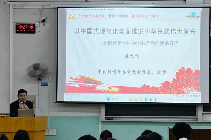 潘九根教授从中国共产党的中心任务讲起,围绕以中国式现代化全面推进中华民族伟大复兴的逻辑必然、科学内涵及目标任务等三个方面,对专题内容进行了层层递进、案例翔实的剖析阐释。他指出,中国式现代化是中国共产党践行初心使命的实践结果、是求索中华民族伟大复兴的历史选择、是创造人类文明新形态的全新图景,既有各国现代化的共同特征、也有鲜明的中国特色。潘九根教授认真分析了以中国式现代化全面推进中华民族伟大复兴的科学内涵,并就其性质、目标、价值等层面的本质要求进行了多维构建。最后,他号召同学们要将自己的人生目标与推进中国式现代化的战略目标全面对接,不断学习、不断成长,居安思危、未雨绸缪,敢于斗争、善于斗争,为中华民族伟大复兴贡献力量。